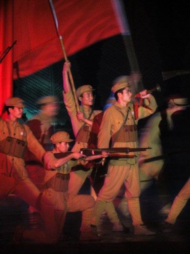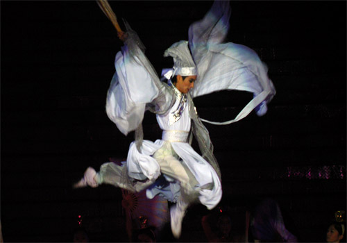 從水中走來(lái),從悠遠(yuǎn)的歷史中走來(lái)。晚上8點(diǎn),沂河湖心北島上燈光絢麗,伴隨著我們所熟悉的沂蒙山小調(diào),演員們開(kāi)始了極具創(chuàng)意和現(xiàn)代科技色彩的歌舞表演,一場(chǎng)震撼人心的大型水上實(shí)景演出正式開(kāi)演。