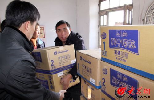蒙牛阿拉乳制品有限公司濟(jì)南銷售處經(jīng)理李營生代表公司向孩子捐助奶粉