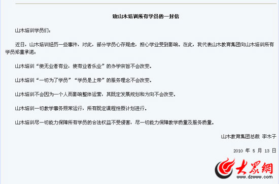 5月13日,山木集團發布告學員公開信,承諾山木培訓所有宗旨和發展規劃不變。