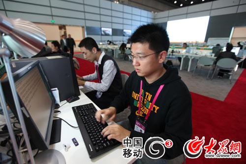 大眾網(wǎng)特派記者在上海世博新聞中心媒體工作間工作中。