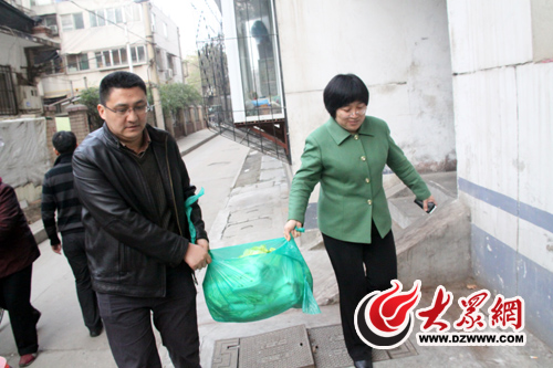 大眾網(wǎng)記者和街道負責人往困難居民家中送菜