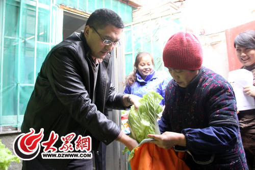 考慮到一些困難家庭運菜不方便,除了給到現(xiàn)場的困難居民分發(fā)大白菜外,大眾網(wǎng)記者和街道辦事處的負責人還專程上門,為一些困難居民送上了愛心白菜。