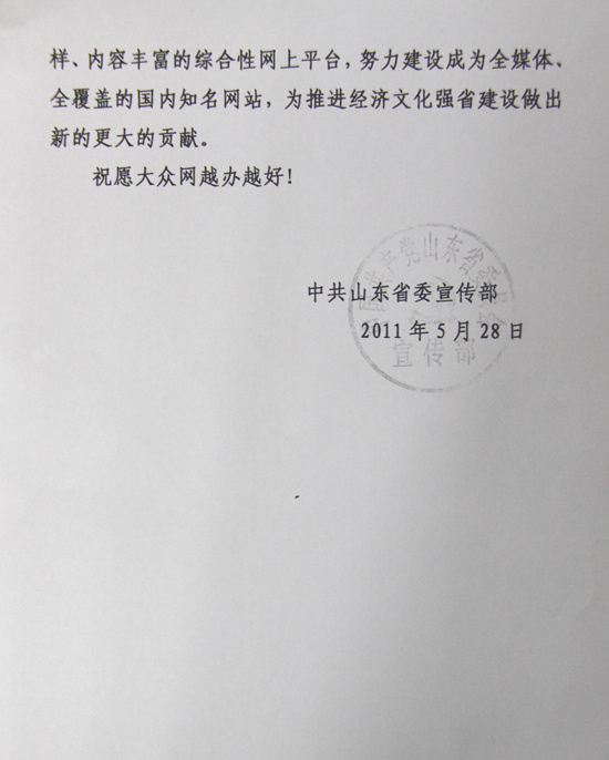 中共山東省委宣傳部賀信