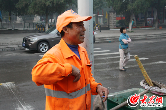 “小伙子,這么早就來了!”遠(yuǎn)遠(yuǎn)得看到記者走來,陳杰笑著打了個招呼。由于提前聯(lián)系過,陳師傅對記者的到來并不感到意外。記者看到,陳杰身高不足一米七,臉色較為黝黑,雖然已經(jīng)年過50,但身體十分健壯。他穿戴著濟南市環(huán)衛(wèi)工統(tǒng)一配發(fā)的橘紅色環(huán)衛(wèi)服和環(huán)衛(wèi)帽,手里拿著短把掃帚和連著垃圾袋的簸箕,腳上白色的球鞋早已變成黑色。“陳師傅,您也很早啊!”記者話音落下后,陳杰笑著伸出4個手指頭:“每天早晨4點起,4點半開干,雷打不動。”通過交談,記者簡單了解了陳杰的情況。陳杰是濟南市歷城區(qū)人,今年52歲,從事環(huán)衛(wèi)工作已經(jīng)整十年了。記者了解到,陳杰與他的妻子都是環(huán)衛(wèi)工人,兩個人負(fù)責(zé)的是經(jīng)十一路部分路段,清掃面積1700多平方米。由于濟南著名景區(qū)千佛山的正門位于經(jīng)十一路中段,所以該區(qū)域人流量大,清潔任務(wù)重,在國慶與重陽雙節(jié)期間更是如此。