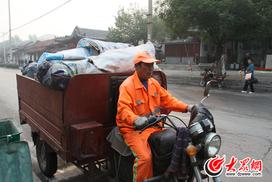 陳杰告訴記者,現(xiàn)在“雙節(jié)相遇”,千佛山廟會正在舉行。為了保持環(huán)境衛(wèi)生,歷下環(huán)衛(wèi)部門在千佛山北門附近放置了8個一米多高的垃圾桶,所以,他要多跑幾趟垃圾處理場。“那您的一日三餐怎樣解決呢?”記者問道。“我和對象輪流回家吃。早晨8點回去,8點半就要趕回來。”陳杰笑著告訴記者。