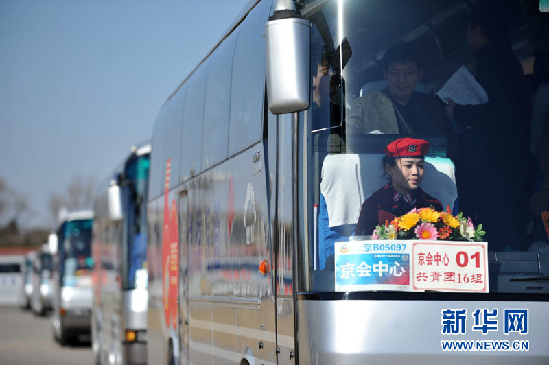 3月3日,一名服務人員坐在委員們乘坐的車中。