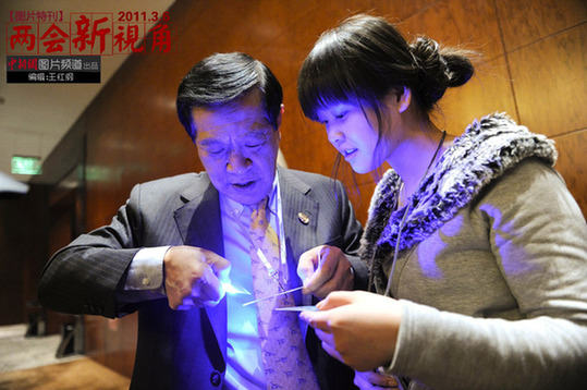 3月6日,作為海外僑胞列席全國政協十一屆四次會議的華人“神探”李昌鈺,在會議間隙向采訪他的記者贈送他自己研制的光波鑒識器。李昌鈺因鑒識過辛普森殺妻案、9·11恐怖襲擊事件、臺灣3·19槍擊案等大案而名震全球。