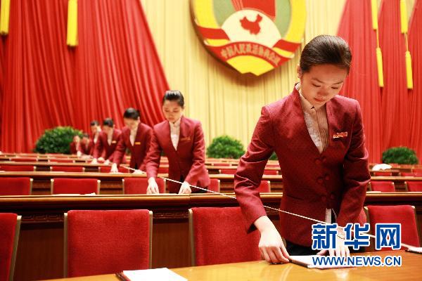 3月8日,在人民大會堂內,女服務員為保證會場整齊采取“拉線”對齊方式擺放物品。在三八婦女節當天,參加有關兩會各項工作的女性們仍然在崗位上忙碌著,美麗著。 新華社記者 王永卓 攝