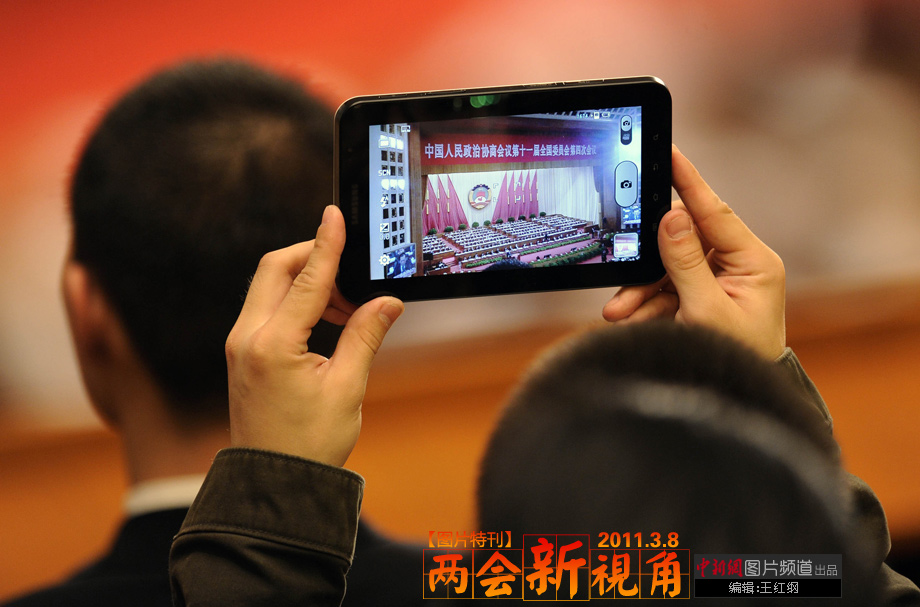 3月8日,全國(guó)政協(xié)十一屆四次會(huì)議第二次全體會(huì)議在人民大會(huì)堂舉行。圖為一名記者用平板手機(jī)拍攝會(huì)議。中新社記者 劉震 攝