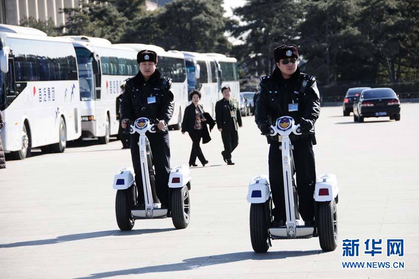 3月3日,北京天安門廣場,一名警察乘坐“智能單警”巡邏車執行兩會安保工作。據了解,這種智能警車最快時速20公里,同時自帶攝像頭,可以將實時畫面傳回指揮中心。新華網 孫巍攝