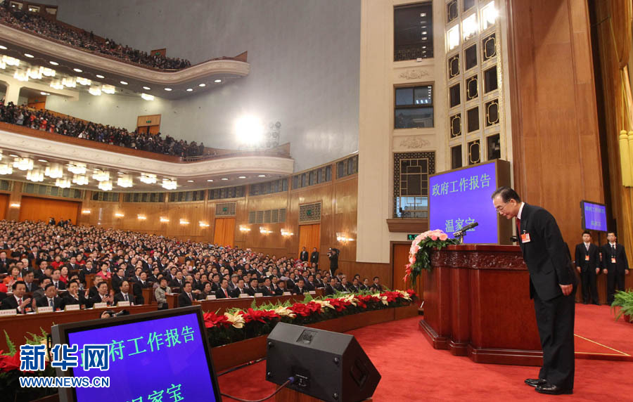 3月5日,第十一屆全國人民代表大會(huì)第四次會(huì)議在北京人民大會(huì)堂開幕。這是國務(wù)院總理溫家寶作政府工作報(bào)告前向全體代表鞠躬。新華社記者蘭紅光攝
