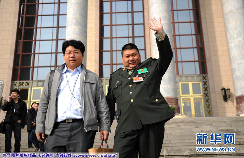 3月13日,全國政協第十一屆四次會議在京閉幕,政協委員揮手告別。圖為全國政協委員毛新宇走出人民大會堂。新華網 翟子赫 攝