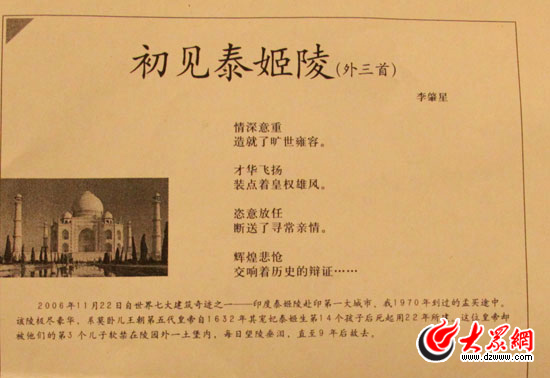 “得送你們點東西。”由于時間關系,剛聊了一會兒,李肇星就著急離開。臨行前,他打開隨身的公文包,將自己寫的詩《初見泰姬陵》,以及一本《世界知識》雜志送給了大眾網記者。