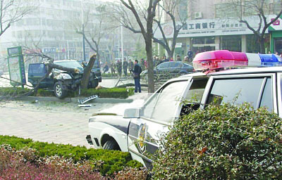在泰安市龍?zhí)堵泛臀幕方徊婵冢跬浇俪值囊惠v萊蕪牌照的豐田越野車將一輛警車撞出馬路,越野車隨后撞向路旁的一棵大樹,樹斷車毀。隨后,他們又劫持了一輛面包車,拐向文化路,后面警車緊追不舍。