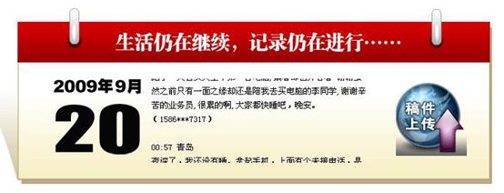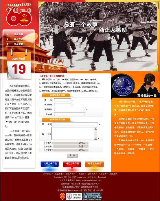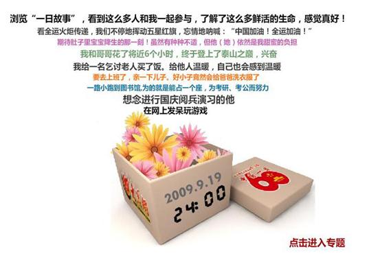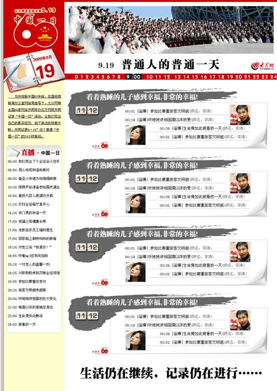 終于在大家的共同努力下,《中國一日》專題隆重登場了,它運用了音樂、動畫,圖片、視頻、文字的綜合表現手段,頁面設計構思新穎,生動活潑又具有較強的沖擊力,色彩柔和親切。它以日記的形式,突出了”中國一日”的主題思想。專題還借助論壇,博客,手機報等渠道,充分發揮了網絡優勢,激勵了廣大網友的參與熱情,記錄了9.19平凡一天的生活點滴,文字是平凡的,但情感是動人的。