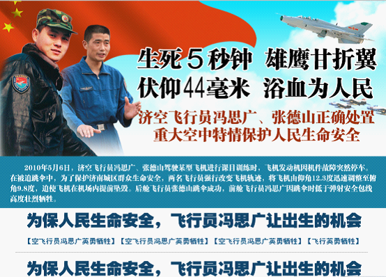 2010年5月6日,濟空馮思廣、張德山兩位飛行員為保護人民財產,在生死關頭做出令人欽佩的抉擇,事件發生后,大眾網迅速推出《生死抉擇 驚天一墜》專題。
