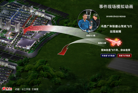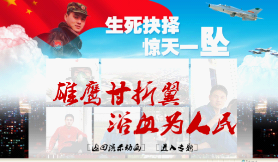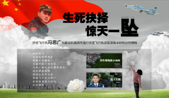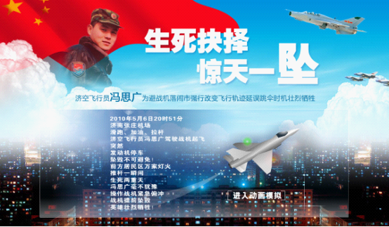 專題最大的設計亮點——在專題首頁中部插入FLASH現場模擬動畫頗有新意。尤其是強調發揮FLASH交互效果,允許用戶自由體驗英雄面對人民的利益和自己的生命只取其一的矛盾選擇,是生是死帶來的兩種結局。在戰斗機飛入畫面之后設置了兩種選擇按鈕。第一種點擊后讓英雄改變飛行軌跡,飛機飛行高度達不到跳傘要求,前艙飛行員馮思廣跳傘時,飛機高度僅有32米,且帶有16度俯角,彈射后降落傘尚未張開即觸地,壯烈犧牲,用自己的身軀保護了千千萬萬群眾的生命財產安全;第二種是點擊后不改變飛行軌跡,前方是繁華鬧市,僅常駐居民就有4000多人,一旦飛機觸地產生的跳躍、沖擊、爆炸,將會把城區炸出一片火海,而飛行員跳傘得以脫身。用小游戲般的敘事動畫力爭真實還原事件過程以及相反的虛擬結局。專題推出不久,模擬動畫效果格外受到網友的關注,網友競相點擊體驗,好評如潮。