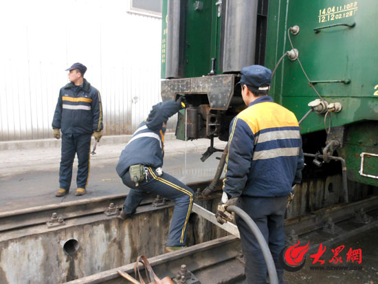 根據工作要求,檢修工每3人為1組,其中兩人負責在火車兩側檢查車體,1人負責維修。記者跟隨張海洋、唐海和秦超檢修K492列車的6節半車廂。與火車站的擁擠、吵鬧不同,檢修廠區沒有乘客只有工人,偶爾一聲火車的汽笛聲,把這個院子襯得更加寂靜。剛剛從昆明奔馳兩天來到濟南的火車停在一米深的水泥溝之上,車廂外的泥土、冰凌和車內小桌上的果皮紙屑顯示著它一路而來的疲倦。而此刻,這列火車正等待著“醫生”們對其進行身體檢查。