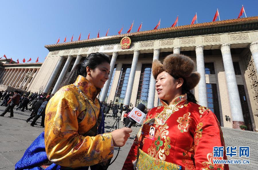 3月14日,第十一屆全國(guó)人民代表大會(huì)第五次會(huì)議在北京人民大會(huì)堂閉幕。這是閉幕會(huì)前,全國(guó)人大代表王樹(shù)芬(右)在大會(huì)堂前接受采訪。新華社記者 楊宗友 攝