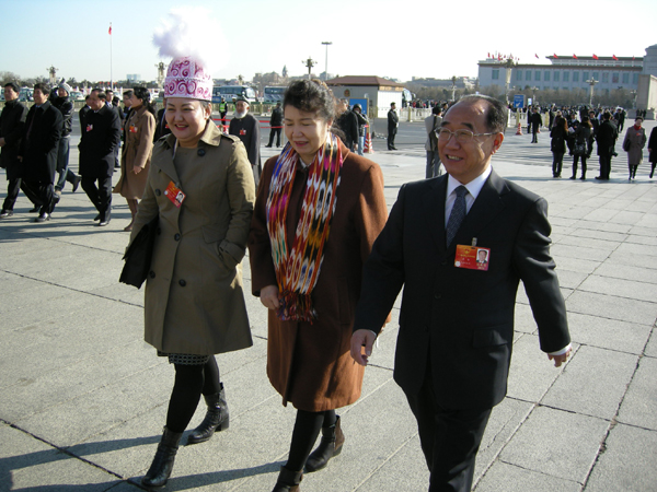 [提要] 3月14日(星期三)上午10時,第十一屆全國人民代表大會第五次會議在人民大會堂舉行閉幕會,表決關于政府工作報告的決議草案等。圖為部分全國人大代表步行入場。