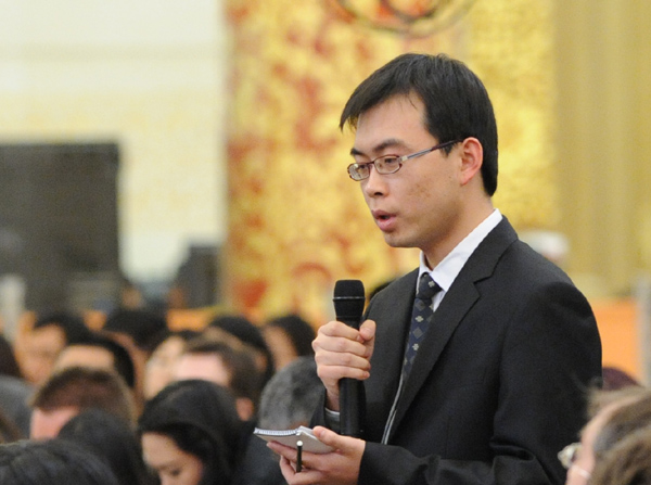 十一屆全國人大五次會議于3月6日(星期二)上午10時在人民大會堂三樓金色大廳舉行記者會,由外交部部長楊潔篪就“我國的對外政策和對外關(guān)系”問題答記者問。圖為中新社記者提問。王翰林 攝