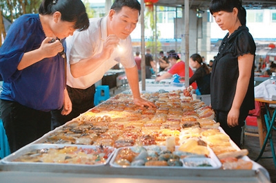 李先生夫婦在姐告“玉城”的貨攤前舉著強光手電仔細地驗看玉石的成色。
