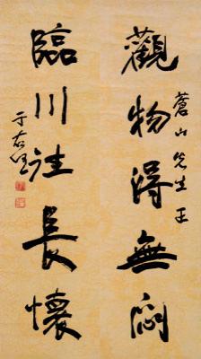 盡管李方玉幾十年來收藏這些名家書畫花了很大工夫,但捐獻給家鄉,一能使這些作品讓更多的人欣賞學習,使其在弘揚中華文化中發揮一定的作用;二是報答故土的養育之恩,算是為家鄉人民獻上的一份愛心。這使我想起了孔夫子的“志于道,據于德,依于仁、游于藝”的名言,感悟到了李方玉先生立志高遠、關愛社會的人生境界。(附圖為李方玉捐獻的于右任對聯)