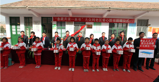 自從今年10月份起,大眾網(wǎng)精心策劃,積極組織愛心單位和企業(yè),決定在山東沂蒙革命老區(qū)和西藏日喀則地區(qū)的中小學(xué)校中,依次組織開展“魯藏孩子共讀一本書”大型愛心圖書室援建活動。今天落成的劉莊鎮(zhèn)中心小學(xué)愛心圖書室,是這次活動籌建的第一個愛心圖書室。本次愛心援建活動共籌得價值6.5萬元的愛心圖書3000冊, 西藏地區(qū)的愛心圖書室募捐活動已經(jīng)結(jié)束,西藏地區(qū)愛心圖書室也將擇日落成。