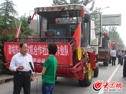 合作社理事長趙佃相帶領跨區作業隊出征前接受當地電視臺采訪