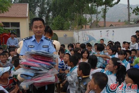 (二)開展幫扶活動,播撒人間大愛。“我自己就是從農村走出來的,我對基層學校的貧困學生總有著一份特殊的感情。”多年以來,鞏元慶同志主動與地處偏遠山區的南湖鎮下湖小學4名困難學生結成一對一長期幫扶對子,資助學費累計已達8400元;并為市特殊教育學校的特殊兒童們送去價值2800余元的體育用品,讓長期生活在閉塞環境里的孩子們切實感受到來自警營的溫暖和關愛。6月1日國際兒童節,他和牽手志愿者帶著拳拳愛心以及為孩子們募集到的自行車、書包、課外書等學習用具,來到五蓮縣戶部鄉王家大村小學和日照街道三小,幫助孩子們圓了心底一份小小的夢想,給他們送去了節日的祝福和關愛。“長大后,我也要象您一樣,去幫助那些需要幫助多人。”六年級的王愷緊緊抱著一個嶄新的書包——剛剛實現的夢想,道出了所有孩子們的心聲。