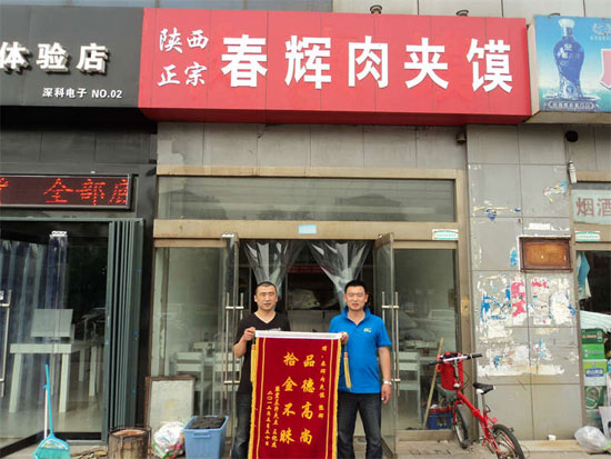 5月23日早上四點多鐘,住在勝宏辰軒的“春暉肉夾饃”老板張輝到車庫開車忙著去張羅店面生意時,突然發(fā)現(xiàn)旁邊車頂上有一個棕色錢包,找開一看內(nèi)有4000余元現(xiàn)金及身份證、銀行卡等物品。當時天微微見亮,小區(qū)內(nèi)寂靜一片,附近也并無一人,此時張輝急于處理店面事宜且無法及時與失主聯(lián)系,等物業(yè)前臺上班后,張輝急忙趕回辰軒小區(qū)請物業(yè)服務(wù)中心協(xié)助尋找失主,恰巧物業(yè)也曾接到過失主的救助咨詢電話。如此一來,物業(yè)服務(wù)中主很快幫忙聯(lián)系到了失主。看到自己的錢包能夠完璧歸趙,失主欣喜萬分,對張輝也是萬分感激。后失主將“拾金不昧 品德高尚”的錦旗和1000元現(xiàn)金送往張老板店里,表示自己的感激之情,張輝拒收了現(xiàn)金,笑著說:“這是我應(yīng)該做的。”