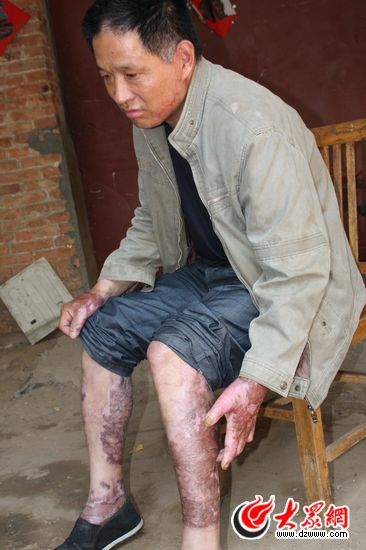 在奮不顧身搶救劉老漢的過程中,沖在前面的劉春虎眉毛全被燒光,上衣和長褲在火苗的吞噬下化為灰燼,僅存的內(nèi)褲,隨著熊熊烈焰迅速碳化緊緊貼在了胯間。劉春虎沒有意識到,當(dāng)他把老人抬出屋外時(shí),除去前胸和左手受傷較輕,整個(gè)面部和全身70%以上的皮膚被燒毀。在昏迷前的一霎那,劉春虎用手向兩腿部位摸了摸,所觸之處,頓見肉皮紛紛脫落,里面的血漿頃刻涌出……