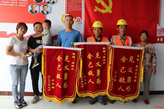 9月4日,王玉強一家將印有“見義勇為 舍己救人”的錦旗送到魏剛、李愛存、吳修業(yè)手中,三面鮮紅的錦旗,不僅僅表達了王玉強一家對魏剛、李愛存、吳修業(yè)三人沉甸甸的謝意,也彰顯了新時代對社會正能量的鼓勵與宣揚。