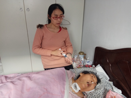“喉嚨這里的管子每隔兩三個(gè)小時(shí)就要消毒一次,否則會(huì)導(dǎo)致發(fā)炎。成人尿不濕戴得久了不透氣,用尿布雖然要洗,但是只要及時(shí)更換她會(huì)更舒服。每隔一小時(shí)喂一次水,吃飯一天要喂五次,一次喂太多她會(huì)不舒服。”即使自己身體也不是很好,但這一連串細(xì)致、繁瑣的工作,已經(jīng)成為周穎十幾年來固定的生活模式。