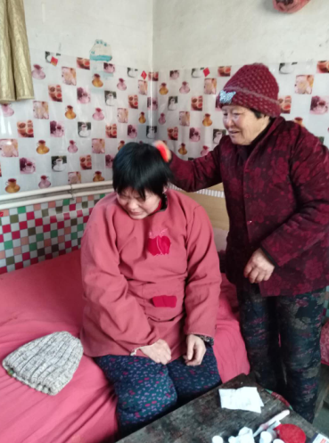 早上六點起床為因腦出血導(dǎo)致癱瘓的兒媳王煥榮做飯、洗衣、按摩、擦拭身體、扶著走路......。因兒子傅茂路患有癲癇,不能干重活,李秋玉主動承擔(dān)起照顧兒媳的重任,自兒媳患病9年來沒有出過遠(yuǎn)門,所有的活動只限于能半個小時來回的“生活圈”。李秋玉的娘家在離馮莊村只有5里的李什,娘家有讓她牽掛的80歲哥哥、嫂子。自兒媳患病,李秋玉從未在娘家吃過一頓飯。即便是每年的正月初二“回娘家”的日子,她也是待上半個小時又匆匆趕回家照顧兒媳。“她也是可憐人,從小沒爹媽,嫁到我們家后又病成這樣,我能體諒她。”兒媳因為患病,對外交流比較困難,婆婆就充當(dāng)兒媳的翻譯官,兒媳的一個眼神,婆婆立馬心領(lǐng)意會。