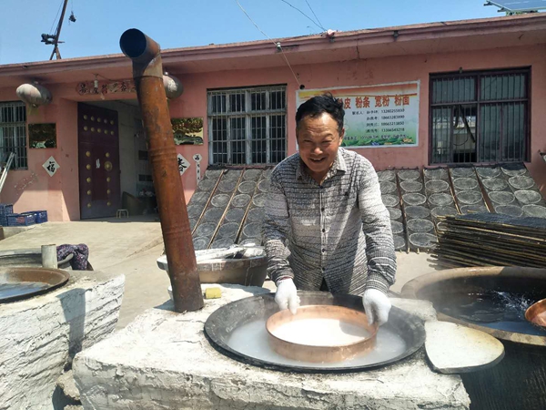 地瓜粉質量保證了,加工粉皮、粉條他一樣嚴把質量關。做這么多年粉皮,孫中坤肯定知道做粉皮的道道,硫磺熏出來的粉皮色澤鮮亮,而且可以保持有水分也不發霉。含有重金屬的明礬是做粉條必加的添加劑,但這些對人體是有害的,孫中坤了解后堅決反對用。不加明礬的粉條不容易成型,他不斷嘗試生產,結果多次失敗,最后他從外地學習了技術,回家投資建了一個冷凍庫,這樣無添加的純地瓜粉條就做成功了。之前沒做成功的粉條一直存到現在他依然沒有銷售,這些年也有許多人勸他把那些粉條便宜處理了,但是他認為不合格的食品賣了就是害人,所以他堅持不賣,就這樣他憑著自己的良心做食品,堅持無添加做粉皮、粉條,誠信經營,對于顧客從不缺斤短兩坑人。