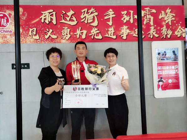 7月16日,孫霄峰再次接到盛女士求助電話(huà),他立即趕往老人家,因敲門(mén)無(wú)人應(yīng)答,孫霄峰與盛女士開(kāi)啟了視頻通話(huà),并在盛女士的指引下進(jìn)入家里。這時(shí),孫霄峰發(fā)現(xiàn)老人趴在衛(wèi)生間地上,便趕忙將老人抱到沙發(fā)上,用毛巾清理老人嘴角和臉上的嘔吐物及血跡,在盛女士的同意下聯(lián)系了120,并協(xié)助醫(yī)護(hù)人員將老人送到就近醫(yī)院。經(jīng)診斷,老人是腦出血,需及時(shí)手術(shù),但所在醫(yī)院無(wú)法治療,孫霄峰又主動(dòng)聯(lián)系轉(zhuǎn)院,辦理相關(guān)手續(xù),老人得到及時(shí)救治,轉(zhuǎn)危為安。得知孫霄峰并非老人的子女,主治醫(yī)生被他的熱心行為深深感動(dòng)。為了感謝這位“大愛(ài)騎手”,盛女士將寫(xiě)有“助人為樂(lè)正能量 鼎力救助暖人心”的錦旗送給了孫霄峰,她說(shuō):“感謝肯德基這個(gè)有溫度的品牌培養(yǎng)這么好的員工,是他讓我感受到人間大愛(ài)。”