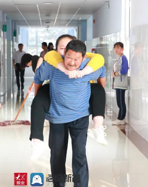 在五蓮縣高澤初中的校園里,經常會看到這樣的場景:早上,一位老人用電動三輪車載著一個女孩來到教學樓下,然后將女孩背到三樓的教室里,安頓好了再離去。上午最后一節課結束前,老人又會早早來到教室門外等候,一下課,就急匆匆走進教室,背起女孩下樓離去。周而復始,風雨無阻,這樣的情景已經持續了三年。這個女孩,就是五蓮縣高澤街道高澤村的何炎格,老人是她的“陪讀爺爺”何志軍。