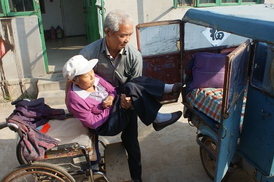 “桂枝25克,白藥25克,知母10克,防風10克,桑植30克… …”在郝玉孝泛黃的記事本上,記者從密密麻麻的字跡中讀到這行字,郝玉孝說,這是1990年他為妻子治類風濕時求來的藥方。一個巴掌大小的小本,寫滿了胡秀玲十多年來的患病情況及各種藥方,記錄了郝玉孝對妻子點點滴滴的愛,也鑒證了這對夫妻35的風雨相隨。12年來,去醫院的交通工具是郝玉孝精心“改裝”過的一輛三輪車,走近三輪車,外表破舊的車里面卻收拾得非常干凈,上下疊了五六層被褥。這輛三輪陪了他快十年了,為了給胡秀玲治病,郝玉孝跑遍了大江南北,湖北、濟南、南京等等都去了,光輪椅就用壞了4個。有時為了求一副藥,他要跑上幾十里路,路上餓了只能扛著,偏方沒少找,就是不管用。“家中無病人,不見鬼和神。”郝玉孝笑著說,為了治好妻子的病,他想盡了一切辦法。1994年他聽說外縣有“神醫”,自己騎車就去了,早上3點出發,晚上9點回來,來回將近100里路。2001年到2005年期間,胡秀玲是去八分場醫院做透析,醫院對透析時間要求很嚴格,要求早晨6點準時到。為了不耽誤透析,郝玉孝總是提前幾個小時帶妻子上路,無論雨再急、雪再大,5年間從未遲到過。