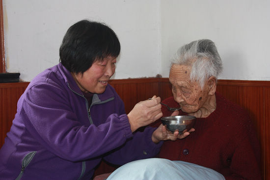林紅春因為年歲較大,雖然記性很好,可是思想較為固執(zhí),所以別人說的話她不一定聽得進(jìn)去,“女兒”李日芳都會耐心的向老人解釋明白,只有她說的,老人才會從心底里信任和同意,所以李日芳每天除了洗衣、做飯、幫老人洗澡,就是和老人聊天,就這樣不是母女的人勝似母女。可是李日芳也有83歲的公婆,也有89歲的親生母親,沒能一直在跟前照顧她們,李日芳的心里很是酸楚和惦念,每次空閑出一點(diǎn)時間,她就會去看望一下公婆,順道也去看看自己年邁的母親。有一次,在看望81歲的公婆后,李日芳就想去看看現(xiàn)在住在自己兄弟家里的老母親,可是兄弟有事出去,大門落了鎖,沒辦法她只能趴在墻頭和院內(nèi)87歲的老母親說上幾句,之后又得立馬趕回家,因為家里還有一位百歲老人更需要照顧。