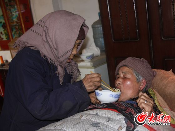 采訪中,我們親眼見證了這對親如母女的婆媳之間的點點滴滴。奶奶龐玉芝做好飯先嘗嘗咸淡、熱涼,然后再送到兒子的嘴邊。盡管母親王翠閣不會說話,但心里明白。看見鏡頭對著自己,不知是激動還是表示對婆婆的感激,一個勁地向往上抬頭,一直地想喊,眼里流出了兩行淚水。