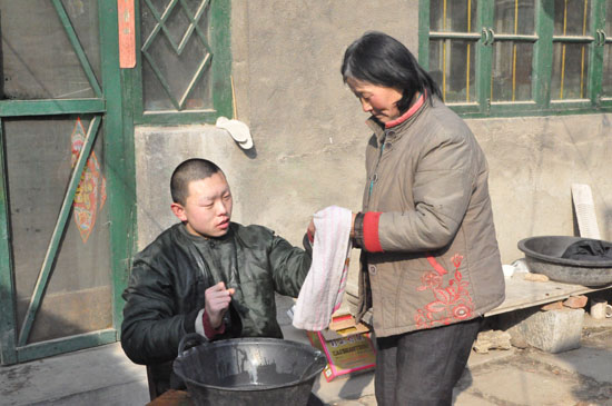 將孩子接到家后,撫養(yǎng)這個殘疾孩子成了劉秀平生活的重中之重。其中的艱辛,村里人看得最清楚。“洗衣做飯、端屎端尿,照顧的無微不至,生怕一點兒不周到的地方。如意眼睛看不見,就講故事給他聽;如意在家里呆著悶,就推著三輪車帶著他在村里曬太陽;如意想吃水餃,就抓緊調(diào)餡兒做出一頓美味的水餃。說實話,親娘也就是做到這份上。”提到這些,黃啟亮一臉敬佩,
