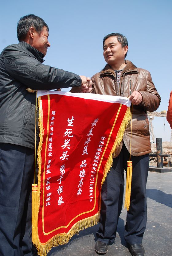 3月14日,風和日麗,無棣漁民張炳興夫婦像往常一樣開著漁船來到該縣北部沿海捕魚。不一刻功夫,海上突然風云突變,霎時間大風卷起了三四米高的浪頭。有著近30年捕魚經驗的張炳興一看天氣不好,趕緊和妻子張羅著收網,就在收網過程中,風浪把船上的錨刮倒了,正好砸在張炳興身上,一下子把他砸倒進海里。站在一旁的妻子劉志芳情急之下,想一把摁住漁網,沒想到沒站穩被卷進漁網一同跌落進了海里。張炳興當時就慌了神。張炳興會鳧水,但妻子不會,于是他一邊馱著妻子,一邊掙扎著像海的四周望去,希冀能看到一艘路過的船只,可是他望見的卻是一望無際的海水。此時,張炳興的雙腿已被冰冷的海水凍得有點抽筋,妻子則漸漸體力不支,但求生的信念讓張炳興一直在堅持著。就這樣在他們掙扎了近15分鐘的時候,張炳興透過浪頭遠遠地看見一艘船正向他們這個方向駛來。“救命啊!救命啊!”張炳興聲嘶竭力的向船上喊道。