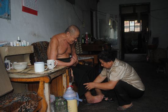 照顧病人說(shuō)說(shuō)容易,但真正做起來(lái)卻是非常不易的。一個(gè)農(nóng)村婦女既要費(fèi)力種地賺錢(qián),又要細(xì)心把丈夫照顧好,還要顧及到女兒和剛過(guò)滿月的兒子,她經(jīng)常忙得顧不上自己吃飯,更顧不上出去逛逛街買(mǎi)件新衣服。在患病早期,丈夫還能簡(jiǎn)單自理,因此,每天下地前,她總是把水杯、藥、紙巾等日常必需品放在丈夫手能夠到的地方才放心,而且經(jīng)常半響午或是半下午都要回家看看丈夫。到了傍晚,拖著疲憊的身軀回到家中,她就急急忙忙做飯,給丈夫喂飯,為丈夫按摩全身一個(gè)小時(shí),擦洗身子,直等到丈夫睡著了她才敢閉眼,夜里還得強(qiáng)迫自己起來(lái)至少2次,看看丈夫是否要喝水、如廁。對(duì)滕樹(shù)貞來(lái)說(shuō),這些辛勞都不算什么,最考驗(yàn)她的還是丈夫的情緒。剛患病的那幾年,丈夫一直不愿接受殘酷的現(xiàn)實(shí),脾氣暴躁,動(dòng)不動(dòng)就摔東西,而她一想起來(lái)也是心酸落淚,但卻不敢叫他看見(jiàn),怕他心理上再受刺激。因此,她總是在丈夫面前強(qiáng)裝笑臉,給他變著花樣做飯、買(mǎi)水果,天好的時(shí)候攙著他在村里慢慢轉(zhuǎn)悠,讓孩子給丈夫講學(xué)校里的趣聞,用他們的童真來(lái)喚醒丈夫面對(duì)現(xiàn)實(shí)的勇氣和熱情。妻子無(wú)微不至的呵護(hù),兒女可愛(ài)乖巧的陪伴,讓丈夫無(wú)比感動(dòng),終于重新拾起了對(duì)生活的希望和對(duì)幸福之家的依賴。