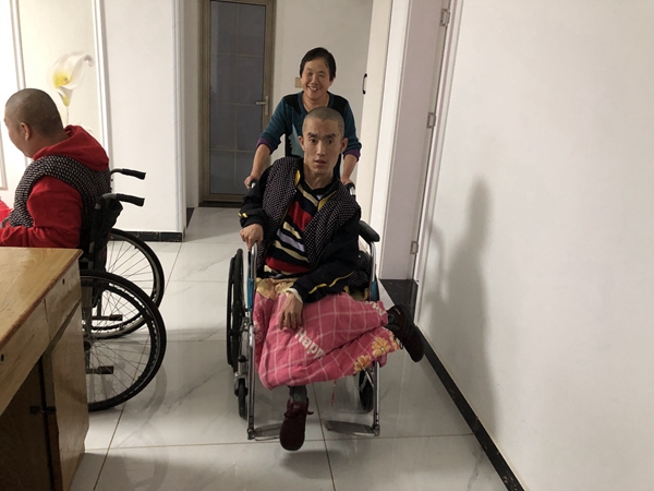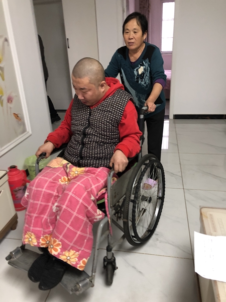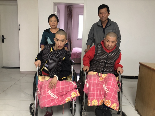 “以前冬天沒暖氣,兩個孩子不能活動怕冷,我給他們每個人都做了30多條棉褲,每天棉褲都像棉被那么厚。他們大小便都不能自理,經常把棉褲、被褥弄臟,我每天給他們換幾條、經常拆洗,但就是這樣,兩個孩子的腿上凍得都是黑色的泡。”提起這些,周素真難掩心酸。“前年我們回遷到花園社區了,冬天有暖氣,孩子也沒那么受罪了。”說到這里,她又笑了起來。“孩子長大了,我歲數也越來越大,已經抱不動他們了,以后我們歲數大了,可能照顧他們就更難了。”周素真說。