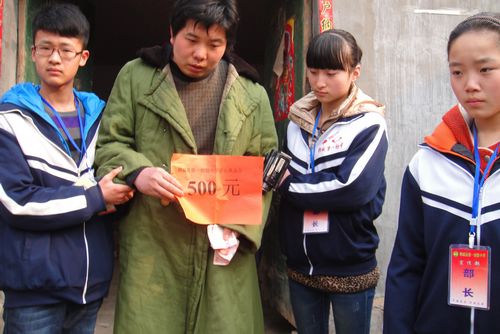 2012年3月5日,該校組織學生代表,來到雙橋鄉黃崗村慰問了貧困家庭黃憲福,又給他剛出生就失去母親的雙胞胎孩子送去了五百元現金以幫其解決燃眉之急。