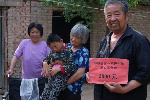 2011年5月28日下午,第一初級中學的6名師生代表,懷揣著全校3000多名師生賣飲料瓶和廢紙換來的2000元現金和部分生活用品,來到鄆城縣張營鎮張三村兩個腦癱兒童家中,為他們送去了沉甸甸的兒童節祝福。