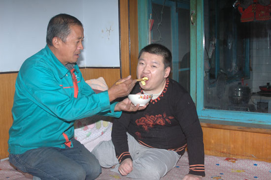 隨著兒子病情的穩(wěn)定,張鼎成夫妻倆漸漸習(xí)慣了這種生活,每天夫妻倆不厭其煩地給兒子一口一口地喂飯,然后給他擦洗身子,把換下的尿布清理干凈。夏天,為避免兒子長痱子,這樣的工作每天要重復(fù)更多次數(shù),走進這個平凡普通的農(nóng)村院子,繩子上常年晾曬著兒子的尿布。當(dāng)別人都享受著兒女承歡膝下,父母頤養(yǎng)天年的歡樂時,張鼎成卻在照料著體重比自己還要重的兒子。在夫妻倆眼里盡管兒子智力上與正常人有差別,生活上不能自理,但是每天看到孩子,總覺得生活還有希望。“只要我們不放棄,兒子一定會好,現(xiàn)在就是拼盡全力也要照顧好他”,夫妻倆深夜經(jīng)常這樣相互鼓勵。日子雖然艱難,但兩個人相濡以沫、同舟共濟,一切都在有條不紊的進行,日子也在平靜中慢慢度過,一年、一年……。