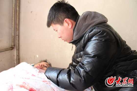 郁有祥上初中時,母親突患腦梗塞并出現大腦萎縮癥狀,父親的身體也每況愈下。后來父母又先后下崗,家里的日子變得非常困難。盡管如此,父母都沒有放棄讓他繼續讀書,就這樣,郁有祥在順利完成了高中學業后,考上了濟寧學院。剛進入大學正在進行新生軍訓的郁有祥,突然接到了母親的病危通知書,他立即向學校請假回去照顧母親。在醫院住了一個多月后,母親的病情總算得到了控制,并且在出院后,可以下床慢慢活動,于是他就返回了學校。然而,誰都沒想到,等到郁有祥寒假回到家的時候,卻發現母親已經癱瘓在床,無法動彈。由于父親身體不好,精神又有問題,無法照料母親,為了能繼續照顧已經癱瘓的母親,讓她的身體不再出什么意外,2013年寒假開學時,郁有祥就在親戚朋友的幫助下,租車帶著母親一起回到了學校,開始了自己的“另類”大學生活。學校在了解到他的情況后,特意為他安排了一個單間宿舍,供他和母親居住;輔導員老師也經常在生活上和學業上照顧他,甚至曾想過在學校為他舉行一次捐款活動,卻被郁有祥給婉言謝絕了。為了母親能繼續治療,郁有祥也開始了自己的打工生活,他在一個學姐的輔導班里幫過忙,在學校里擺過地攤,發過傳單……在學校的時候,他每天早晨5點鐘會準時起床做飯,然后喂母親吃飯、吃藥,之后自己再吃飯、打掃衛生,每一項都安排得緊張而有序。每天上午10點下課后會有20分鐘的課間休息時間,這個時候他都會一路小跑回宿舍幫母親翻身、換尿布、喂水。中午的時候,郁有祥在餐廳買好菜打包帶回宿舍喂給母親吃。母親全身不能動,每隔一個小時他就得幫母親翻一下身,否則會生褥瘡。白天翻,夜晚也需要翻。他說自己再累再辛苦也不算什么,只要母親能在自己的照顧下好好地活下去,那他所做的一切就都值。