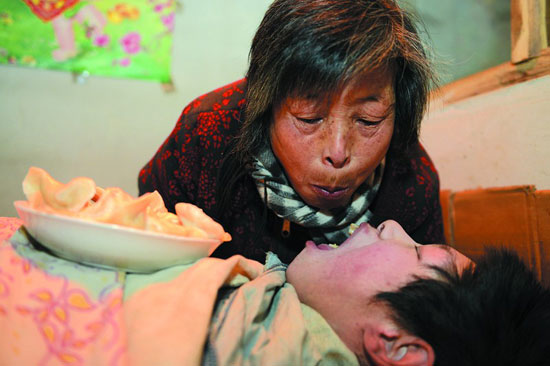 王均秀用炕頭上的大鍋蒸熱了餃子。然后,她端著上了炕。她將餃子咀嚼后,喂入招弟的口中,這頓飯花費了近一個小時。像這樣的“程序”,王均秀每天得進行兩三次。